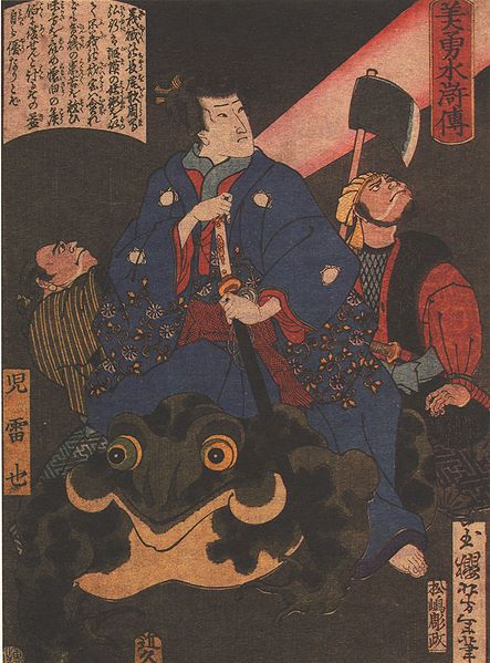 中国の古典から生まれ、江戸文学や歌舞伎に登場する 架空の忍者。蝦蟇の妖術を駆使して活躍する。中国・宋 時代の説話『黠盗我来也(かっとうがらいや)』から来てお り、江戸時代に出版された合巻『児雷也豪傑譚』で登場し た。この作品で児雷也が蝦蟇、大蛇丸が大蛇、綱手が蛞 蝓(なめくじ)の妖術を駆使する設定が人気を博し、その 後の作品の元となる。 忍者マンガNARUTO-ナルトでも同じ設定で登場してい る。 |
